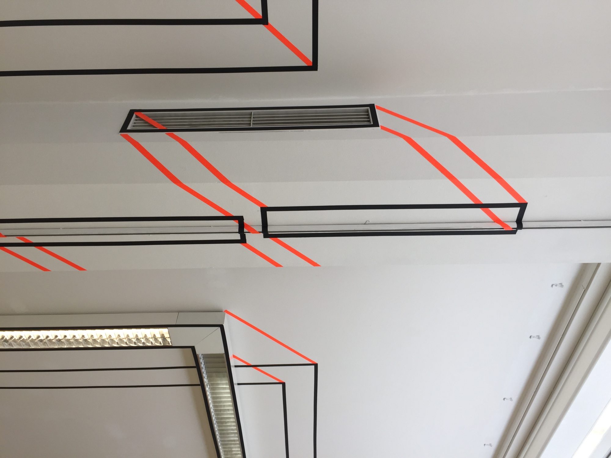 Die an der Decke der Berliner Galerie Nord vorhandenen Elemente, wie Leuchtsysteme, Scheinwerferschienen und Lüftungsgitter, wurden durch eine simple zweifarbige Parallelverschiebung hervorgehoben, führen zu perspektivischen Verwirrungen und neuen, eigenen räumlichen Gebilden, die unvorhersehbar vor Ort entstanden.