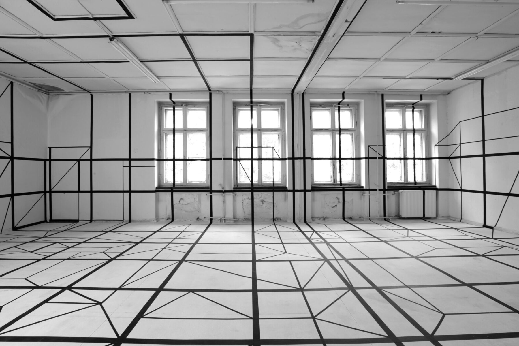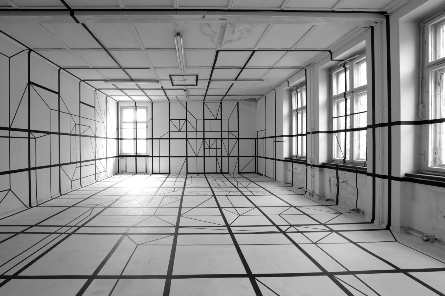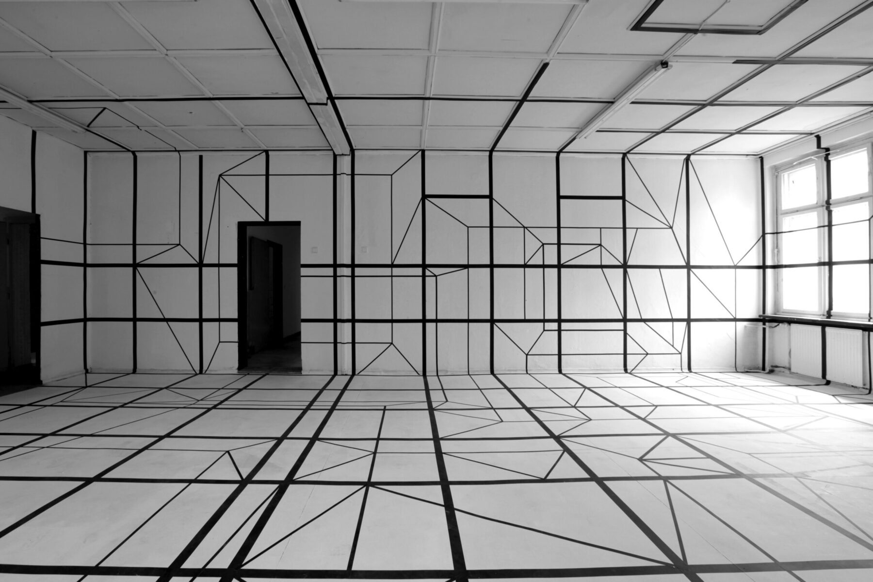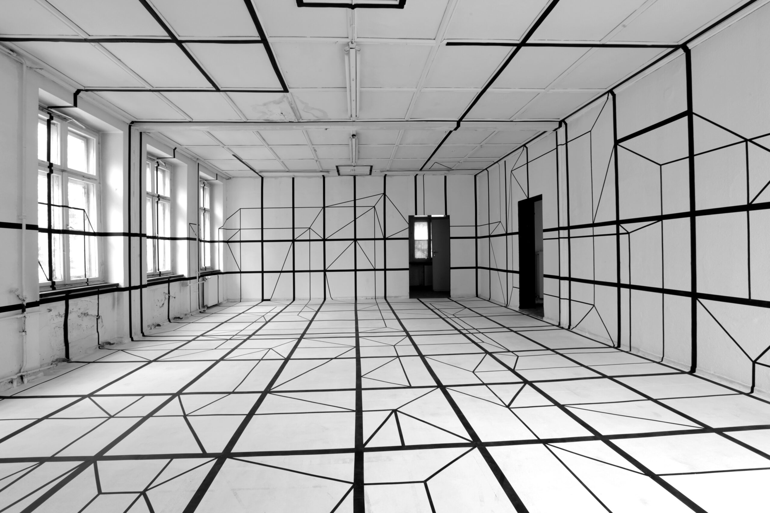 Das vorgefundene Deckenraster gibt die Linien für den Raum vor, wird vergrößert, verkleinert, geteilt, vervielfacht und neu geordnet. Es entsteht ein Dialog mit der vorgefundenen Architektur, eine Zwiesprache, die das Raumerlebnis des Rezipienten in den Mittelpunkt stellt.