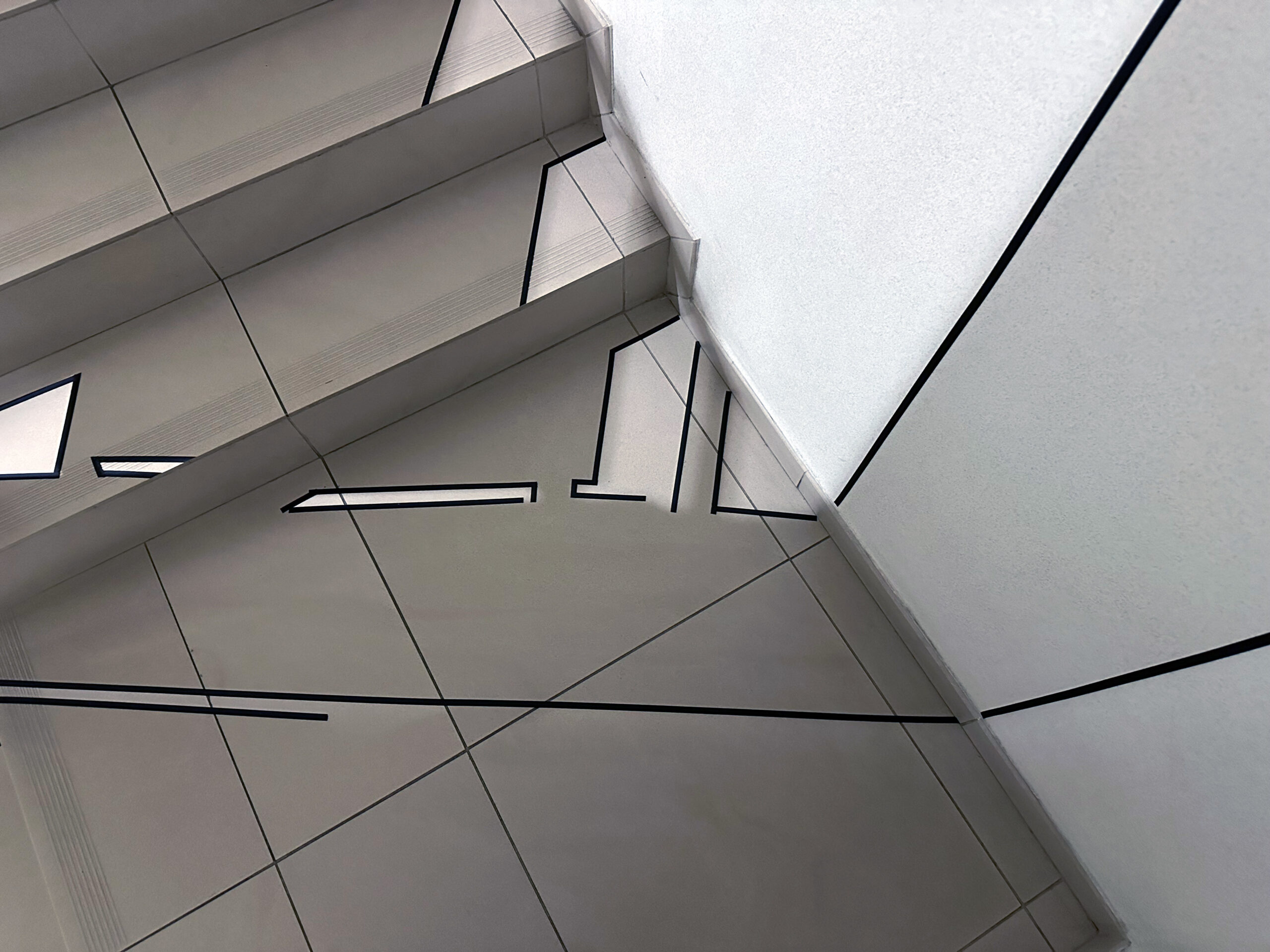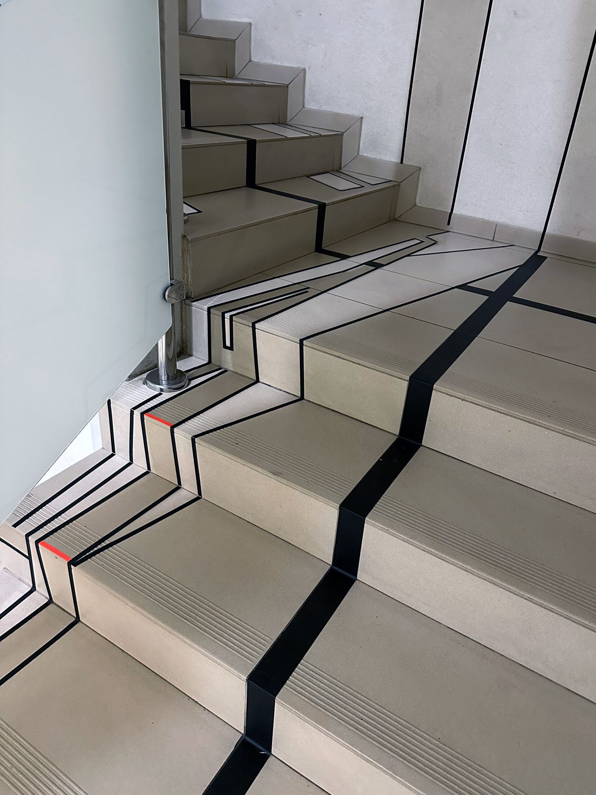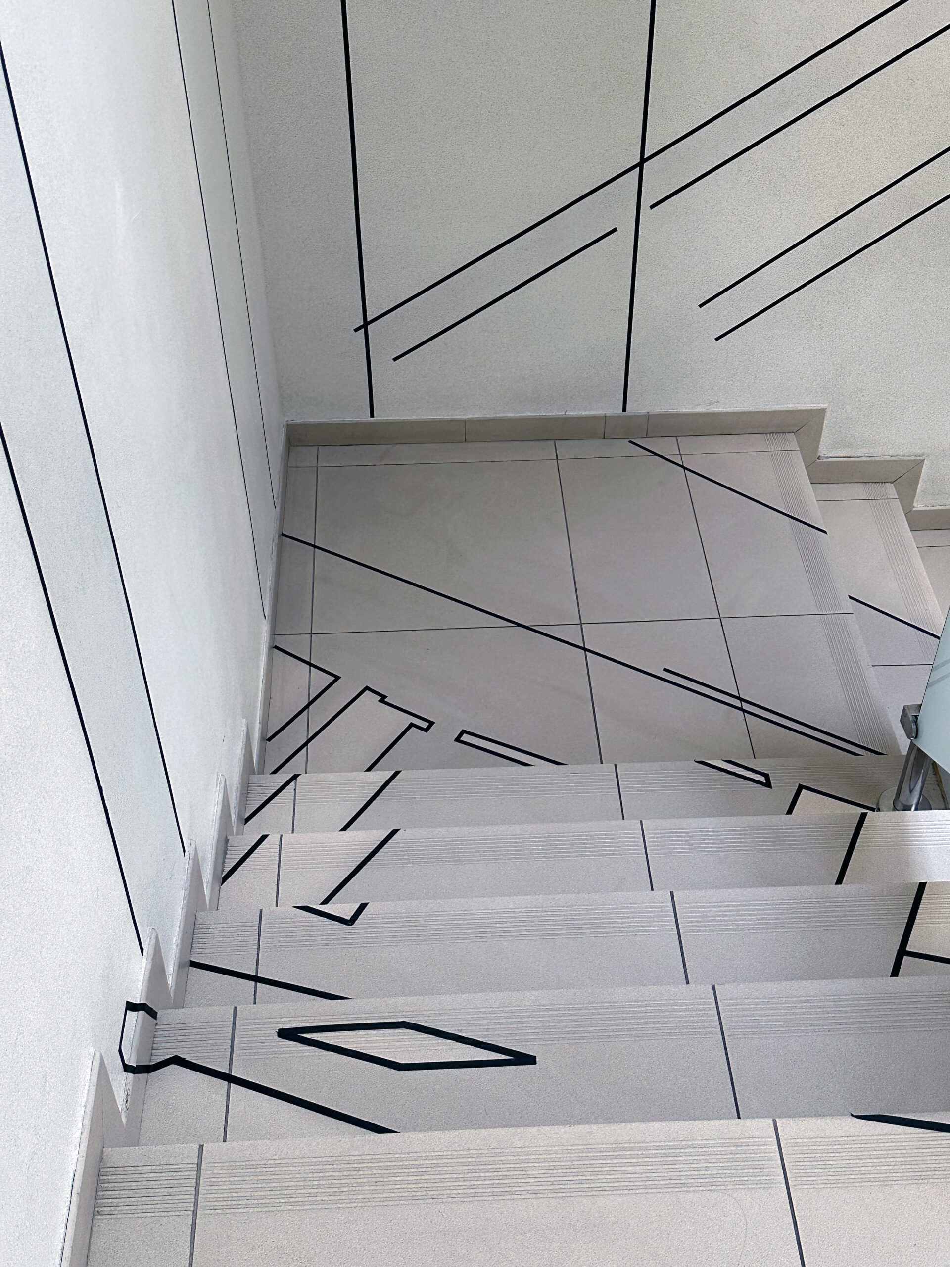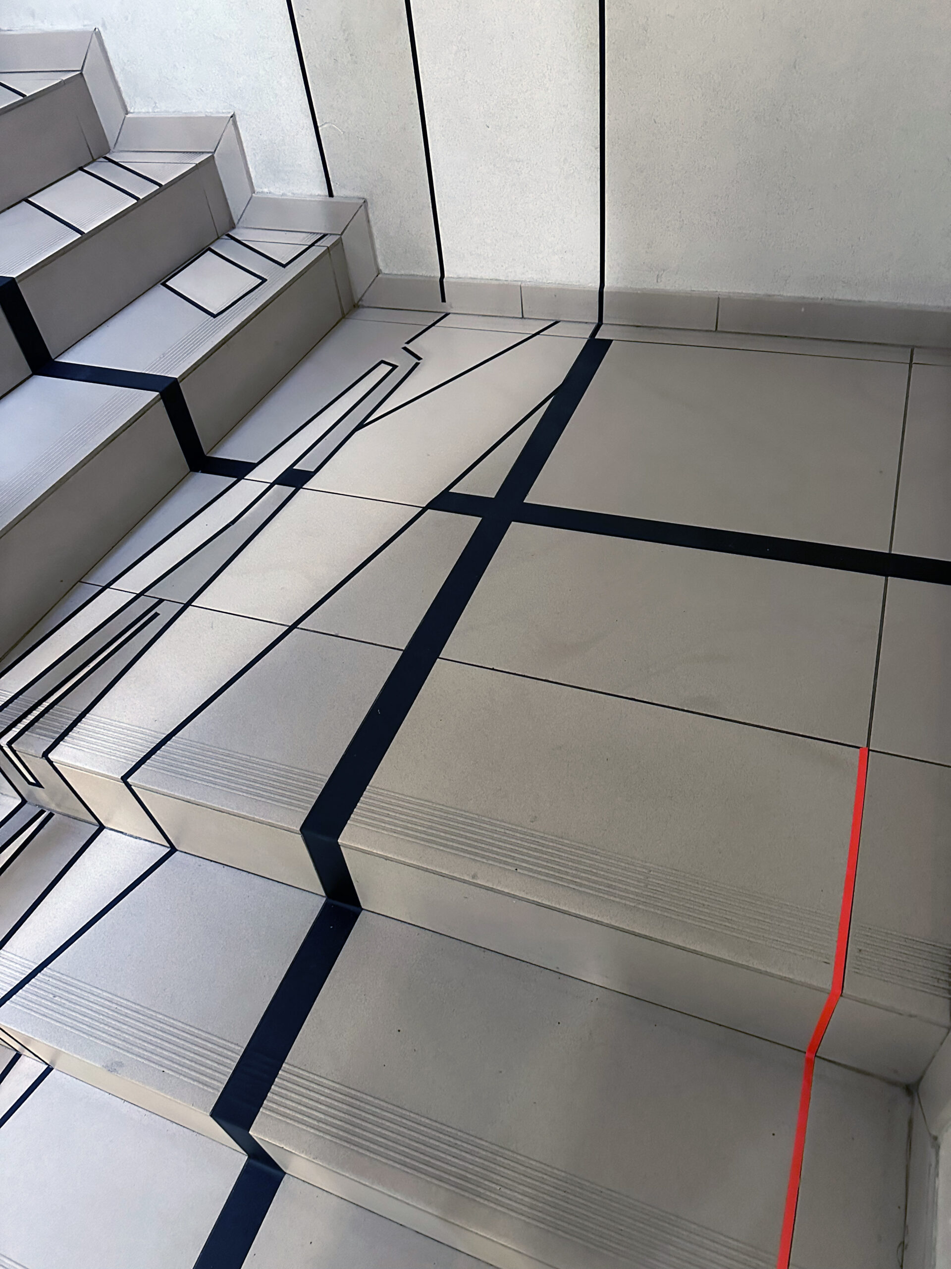 Installation mit Klebebändern (unterschiedliche Breiten und Farben) über 3 Etagen des Treppenhauses