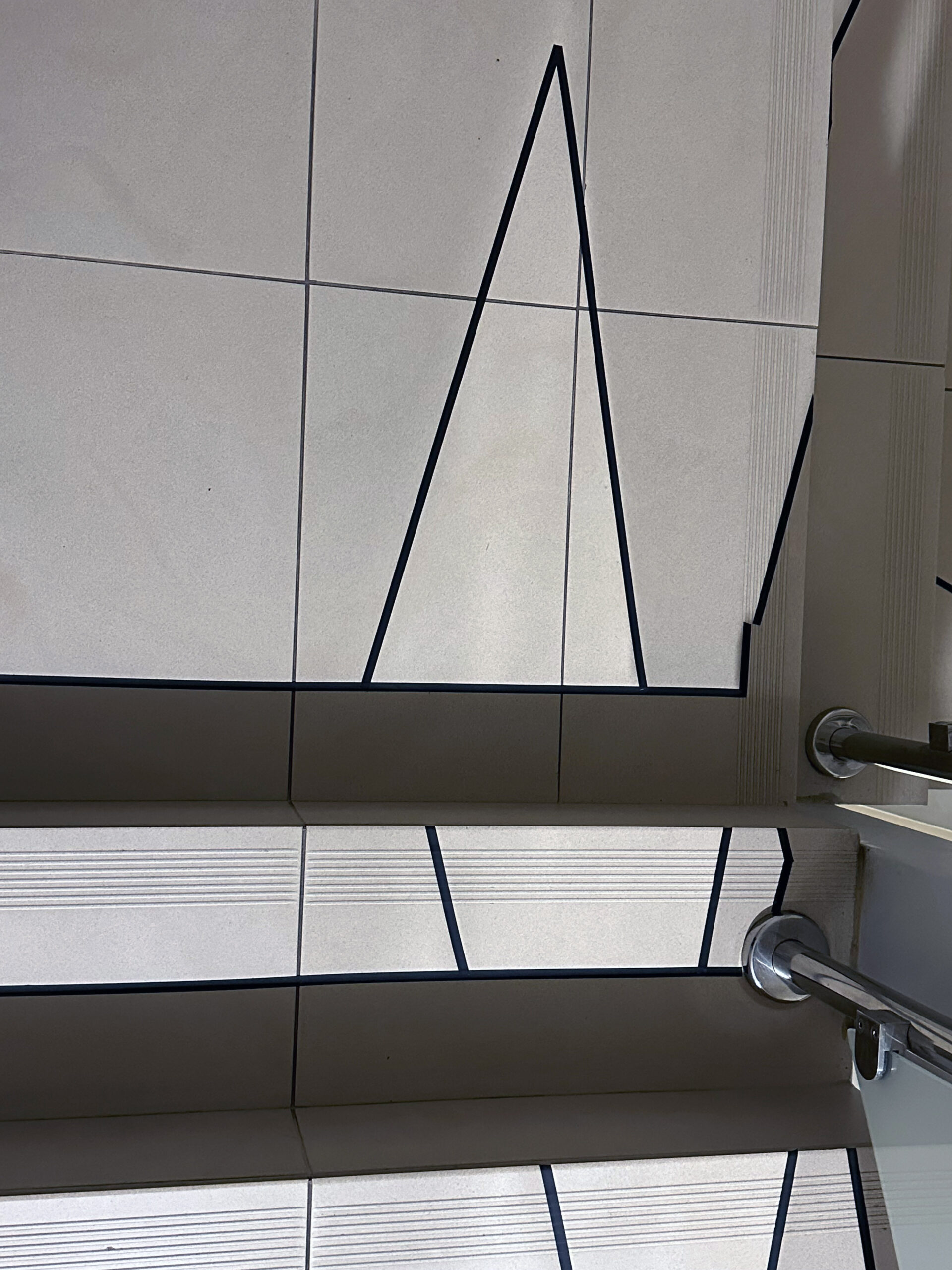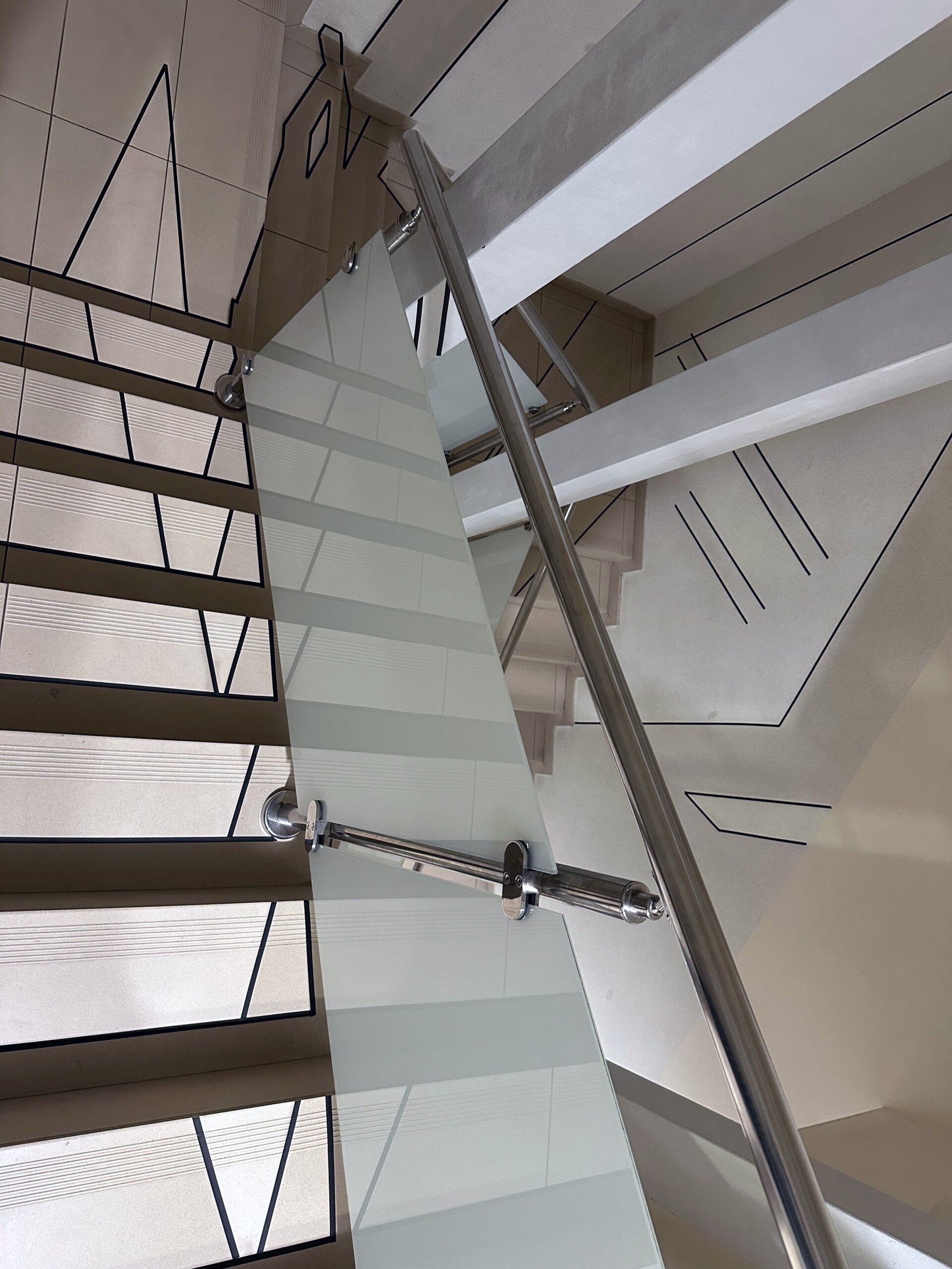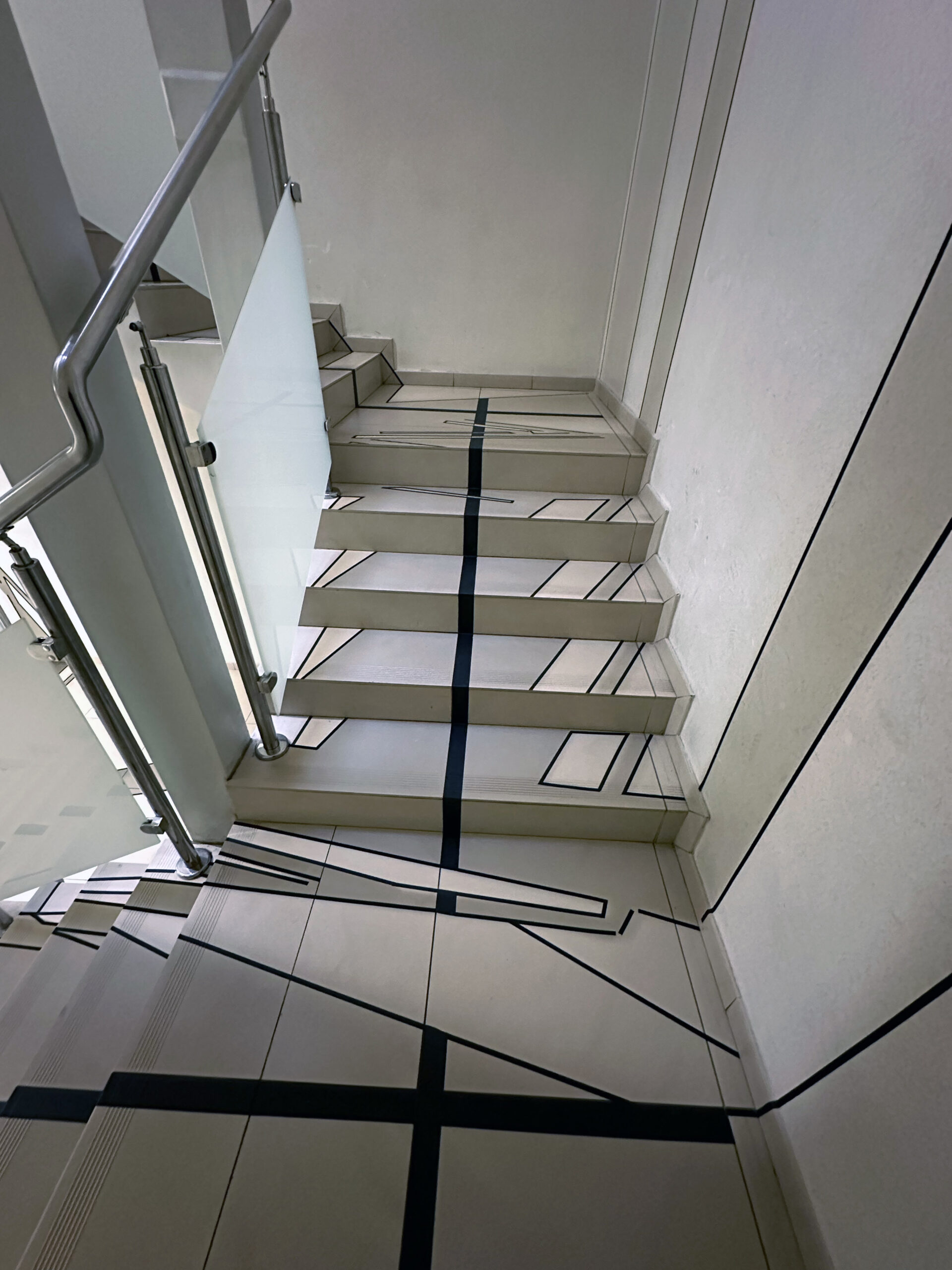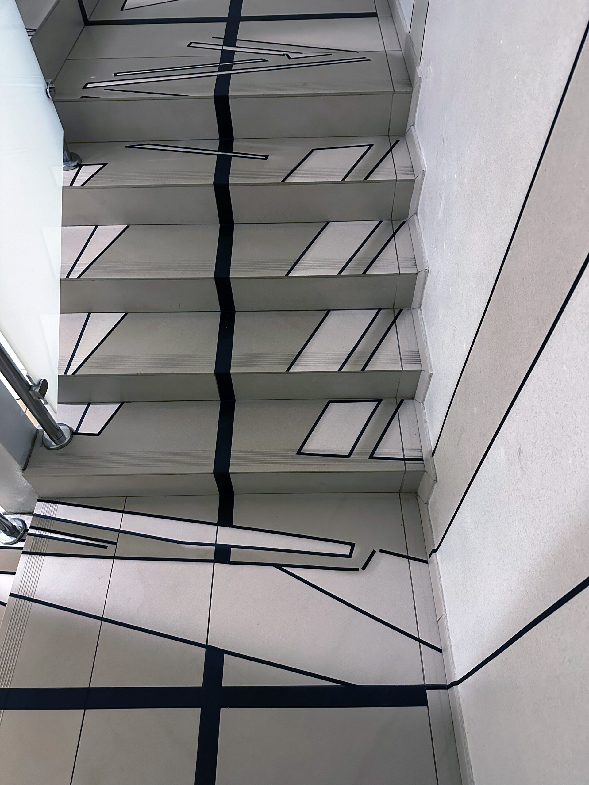 Installation mit Klebebändern (unterschiedliche Breiten und Farben) über 3 Etagen des Treppenhauses