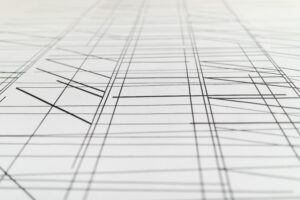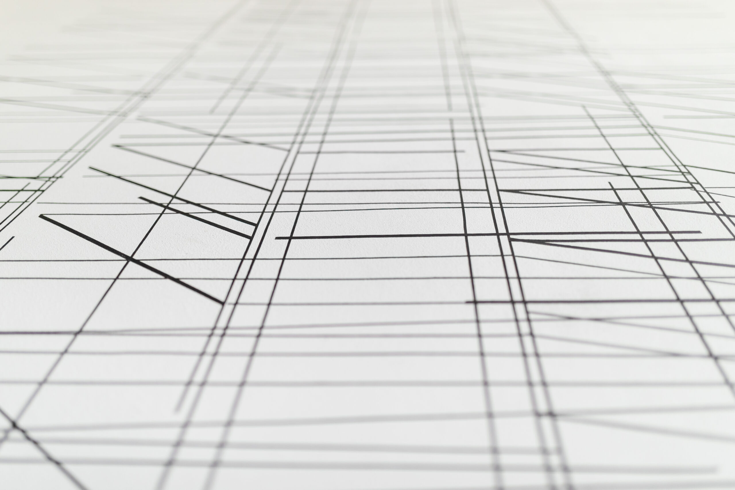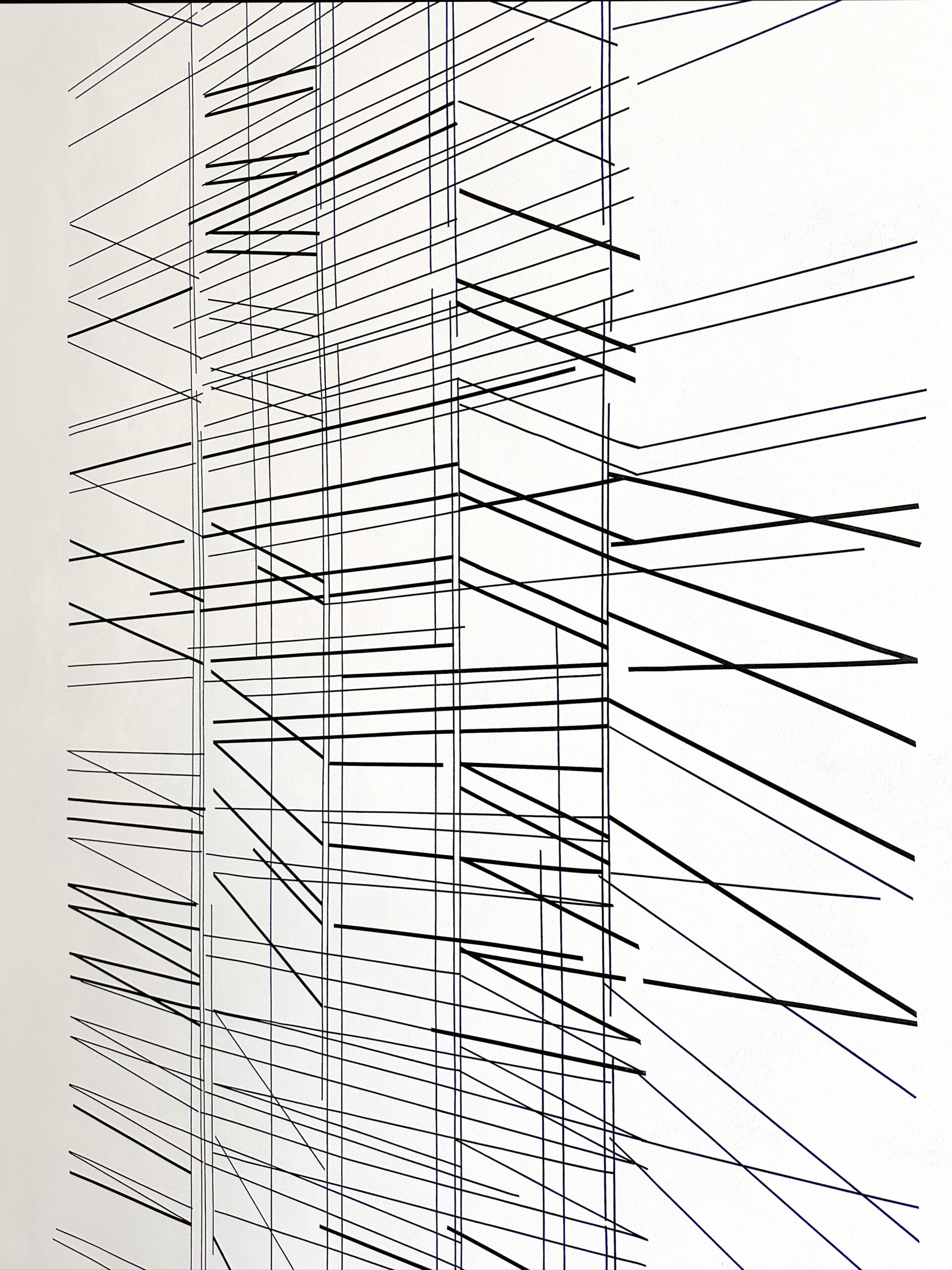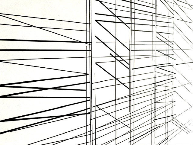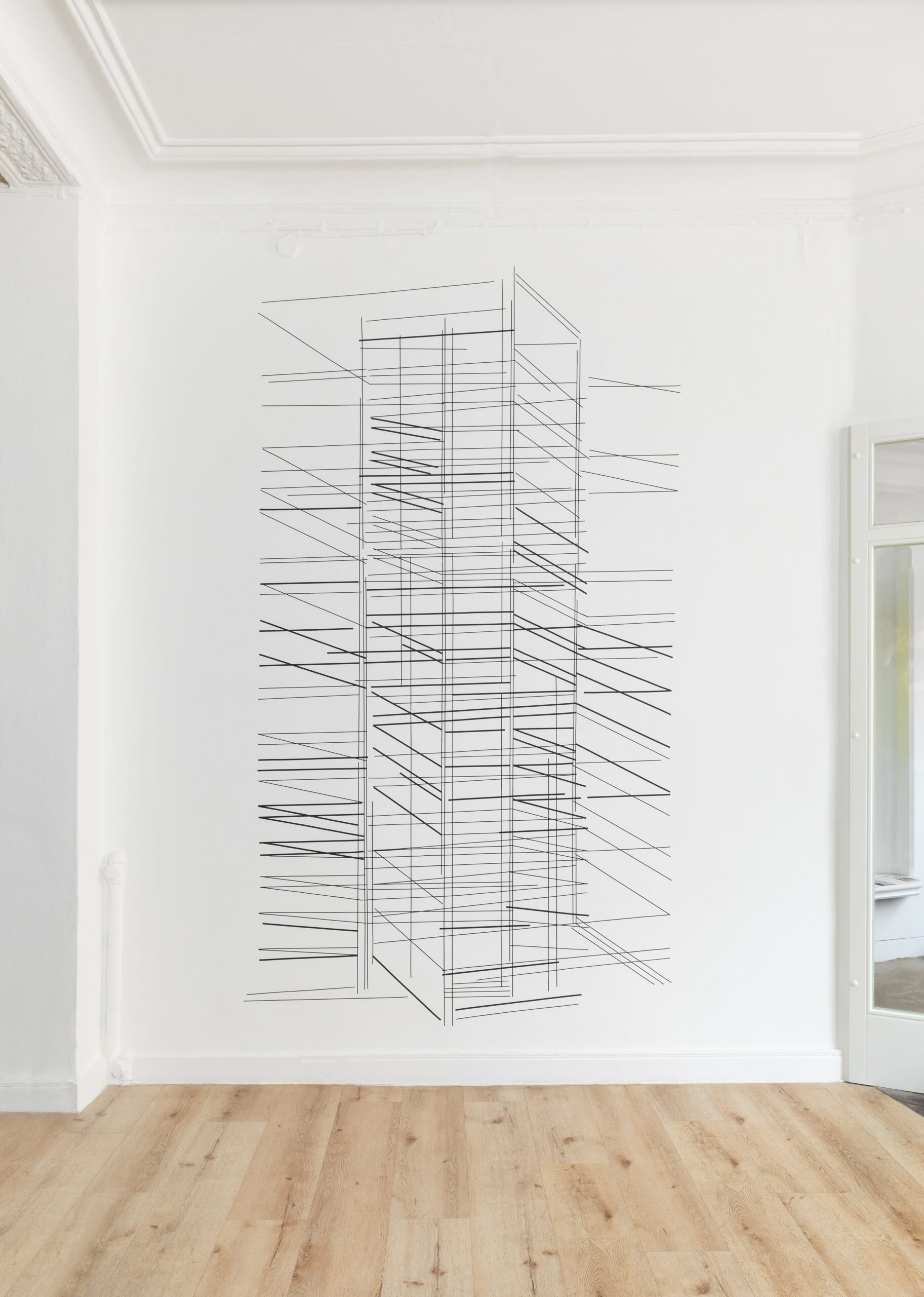 Die Konturen eines solchen Gestells werden in ein Linienskellett aufgelöst und mittels schwarzer Klebebänder direkt auf die Wand übertragen. Durch die Drehung, Verkleinerung und Verschiebung eines zweiten Gestells entsteht eine Überlagerung, die an den Rohbau eines Hochhauses erinnert – ein fragiles Gerüst aus Linien.
