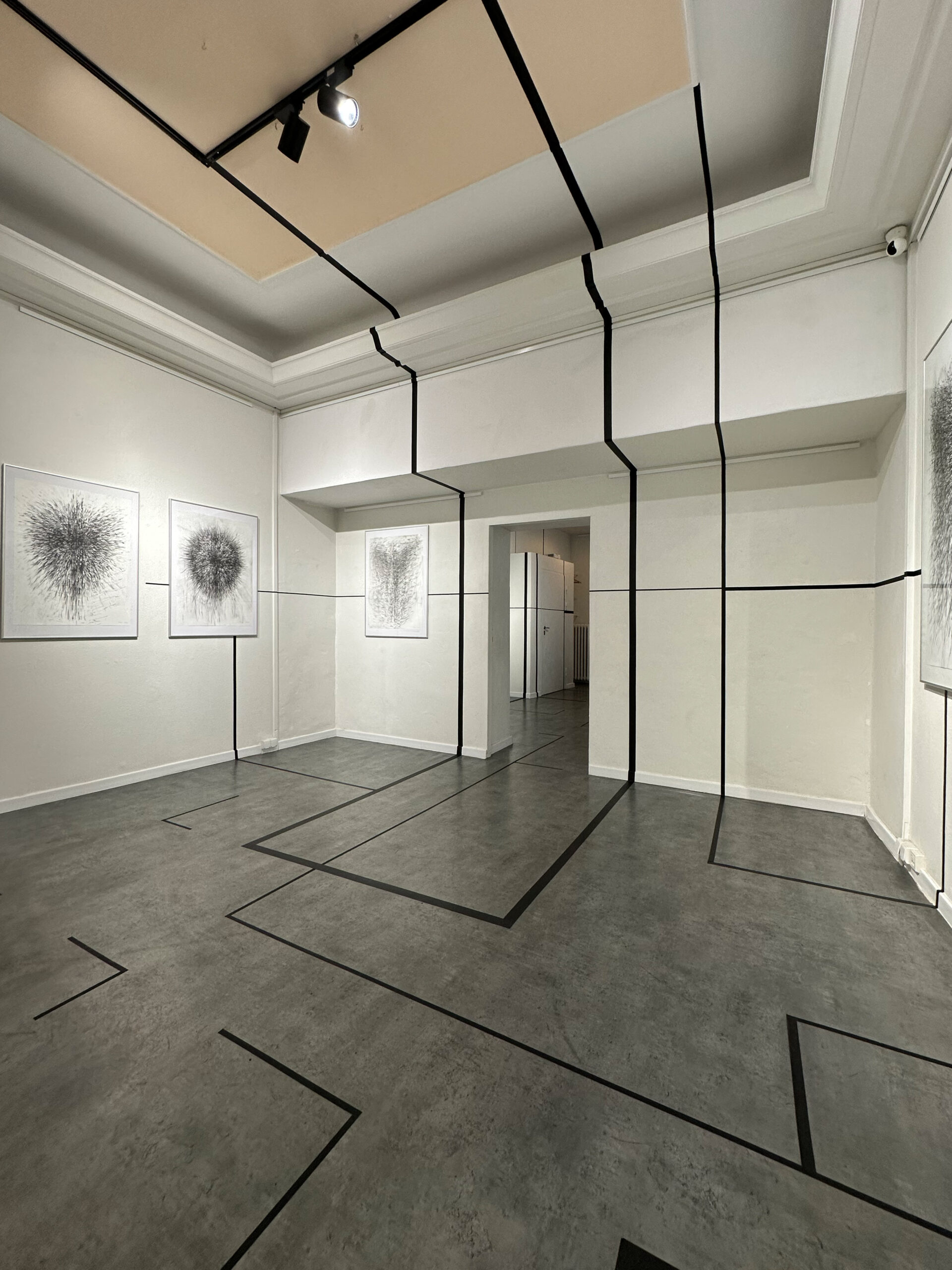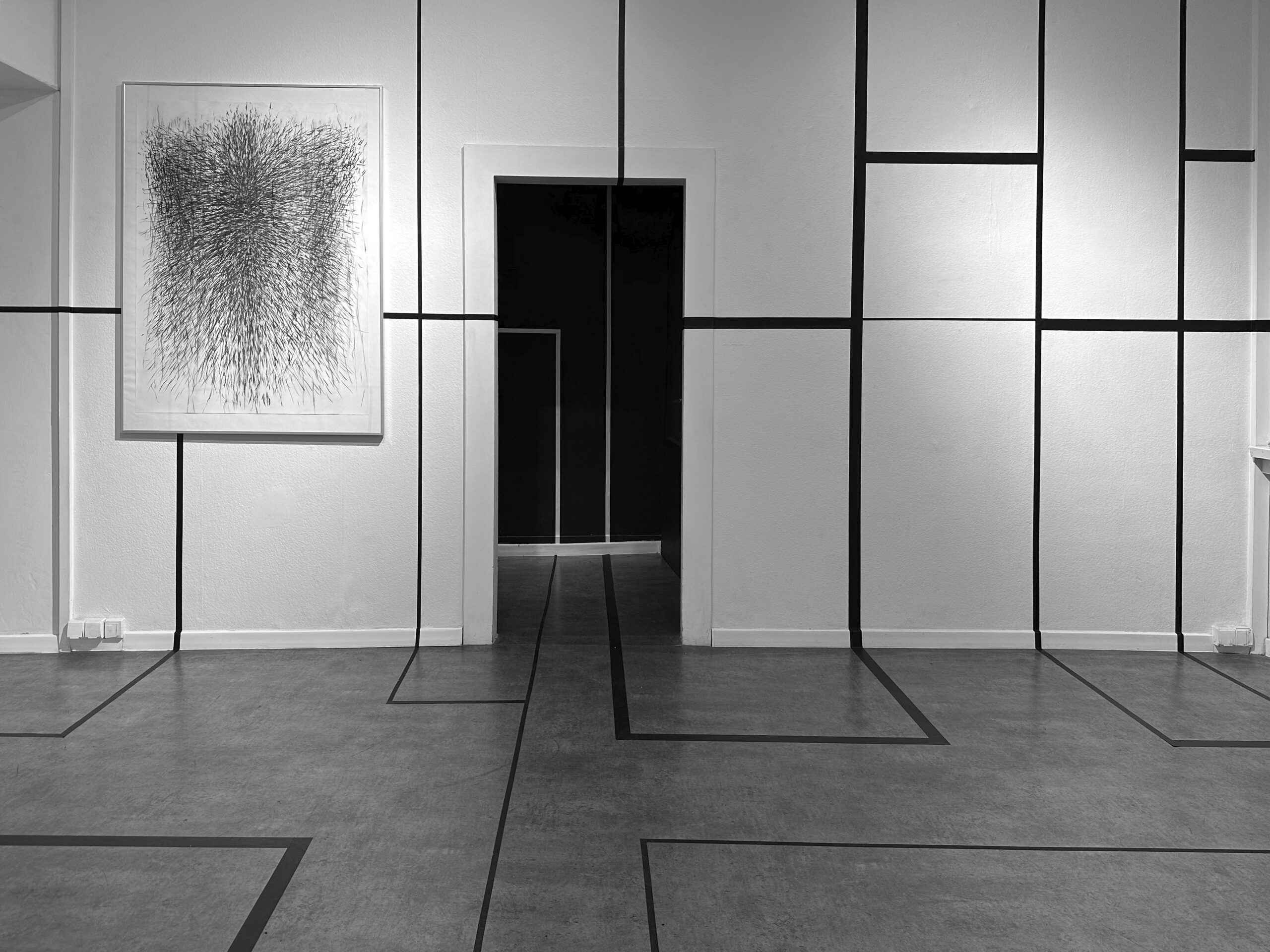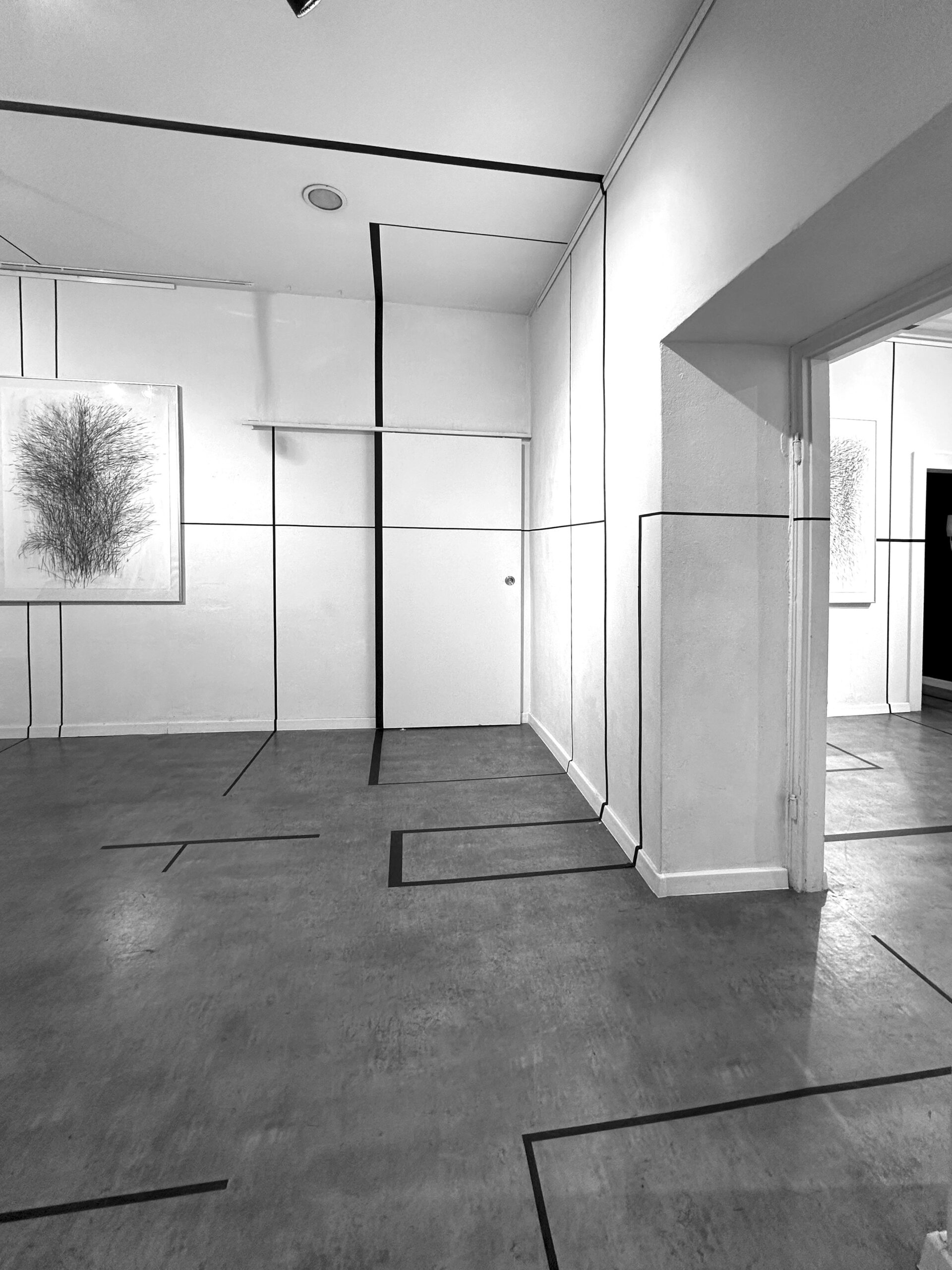 Doris Titze’s body-sized paintings interact with Angela Lubič’s linear spaces in the greatest possible contrast. At the same time, they combine a basic artistic attitude that only becomes visible at second glance. The organic structures of the drawings refer to the liveliness and spontaneity of the architectural lines. Their spatial communication in turn reveals the consistent non-representational nature of the drawings. The surface becomes the space, the space becomes the line and vice versa. Both enable communication, movement and encounters.