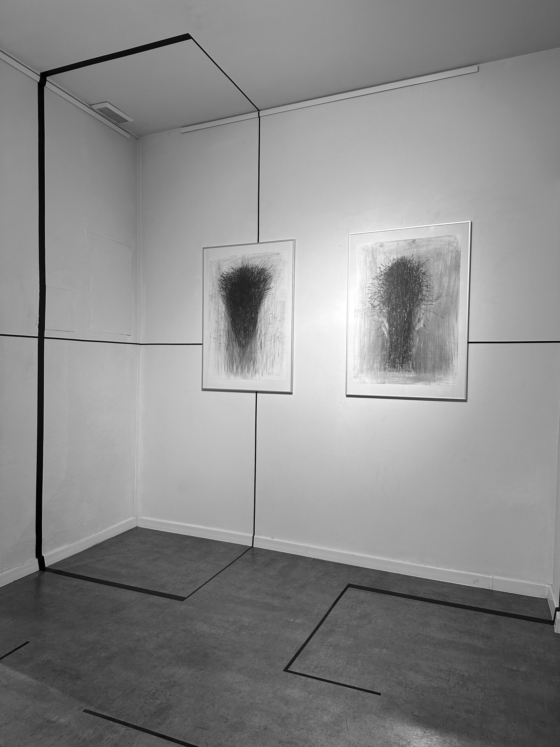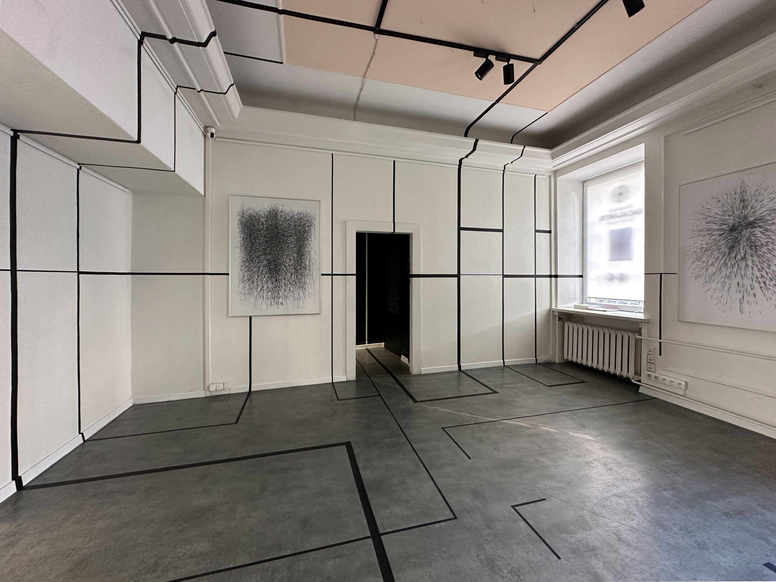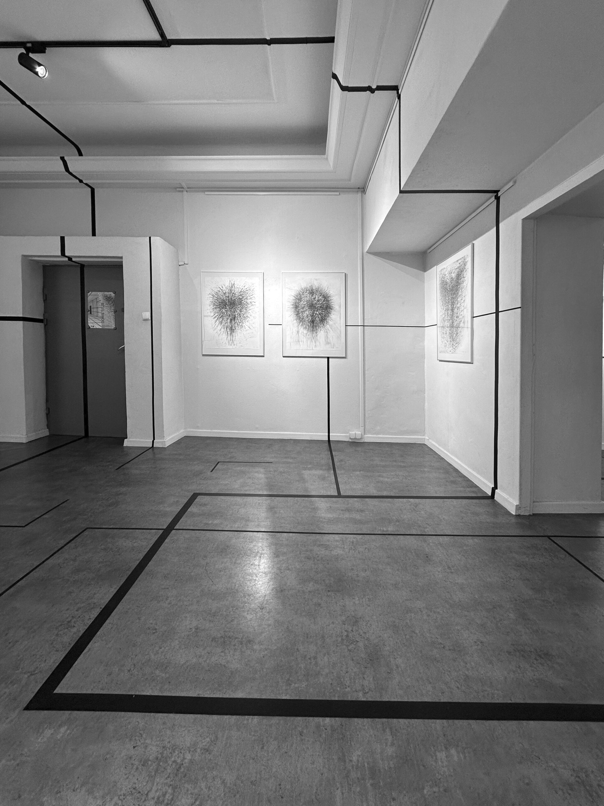 Doris Titze’s body-sized paintings interact with Angela Lubič’s linear spaces in the greatest possible contrast. At the same time, they combine a basic artistic attitude that only becomes visible at second glance. The organic structures of the drawings refer to the liveliness and spontaneity of the architectural lines. Their spatial communication in turn reveals the consistent non-representational nature of the drawings. The surface becomes the space, the space becomes the line and vice versa. Both enable communication, movement and encounters.