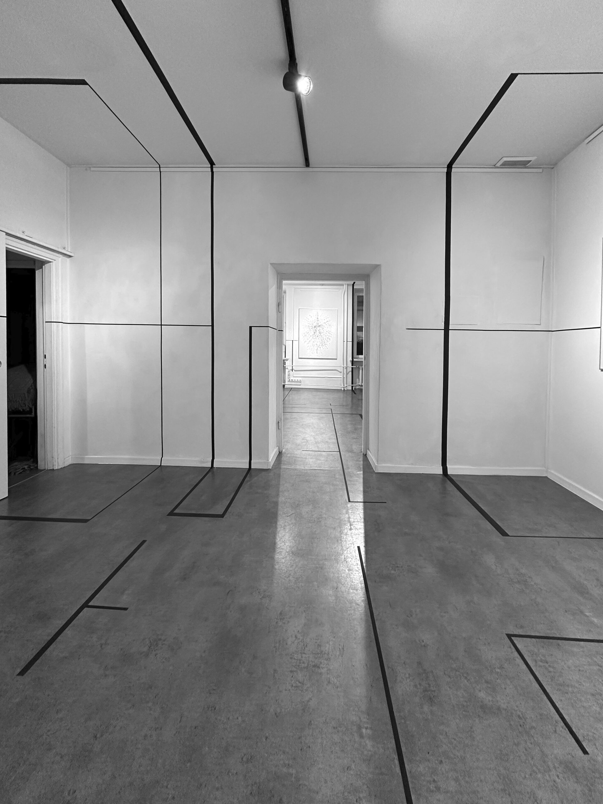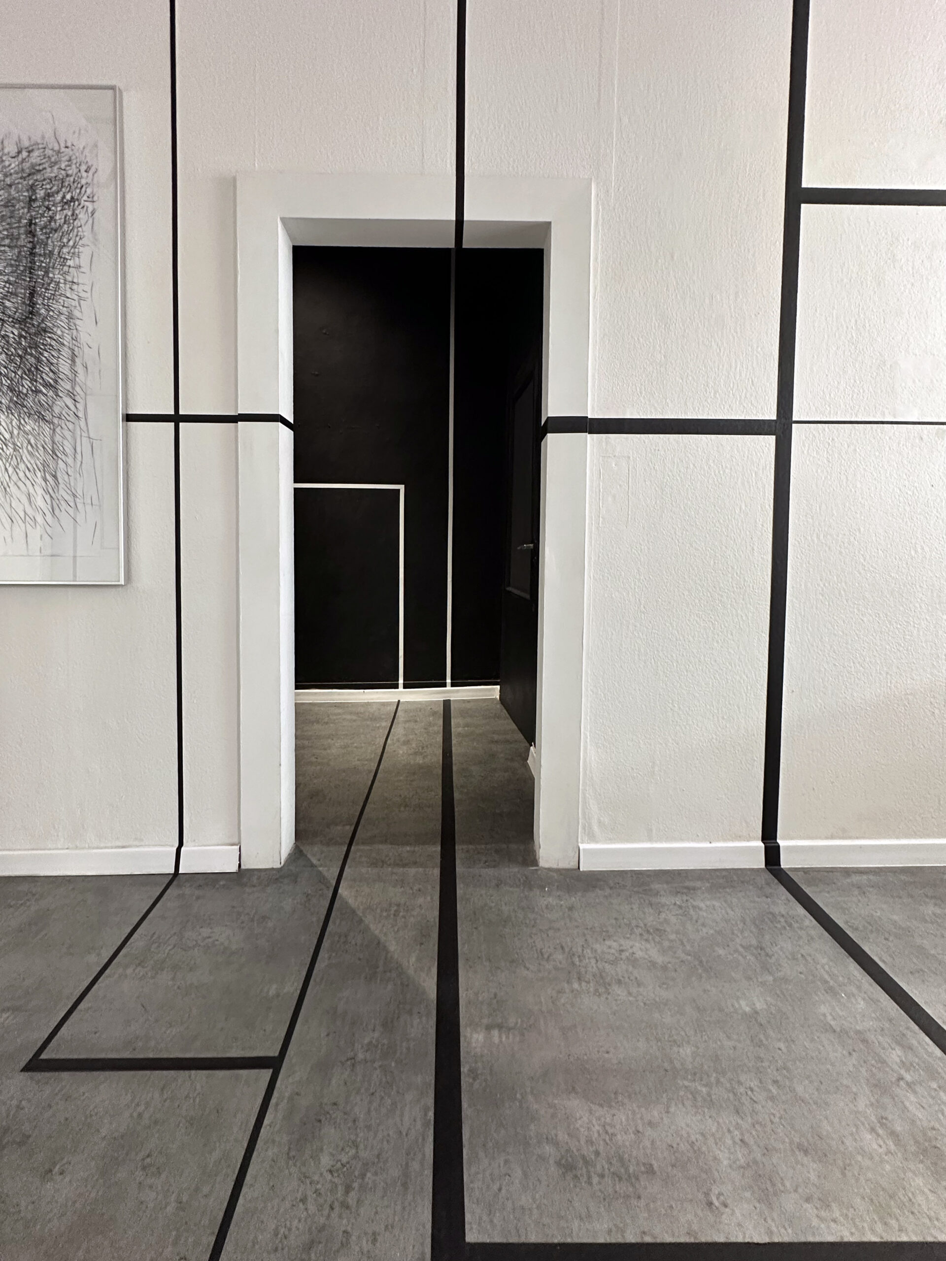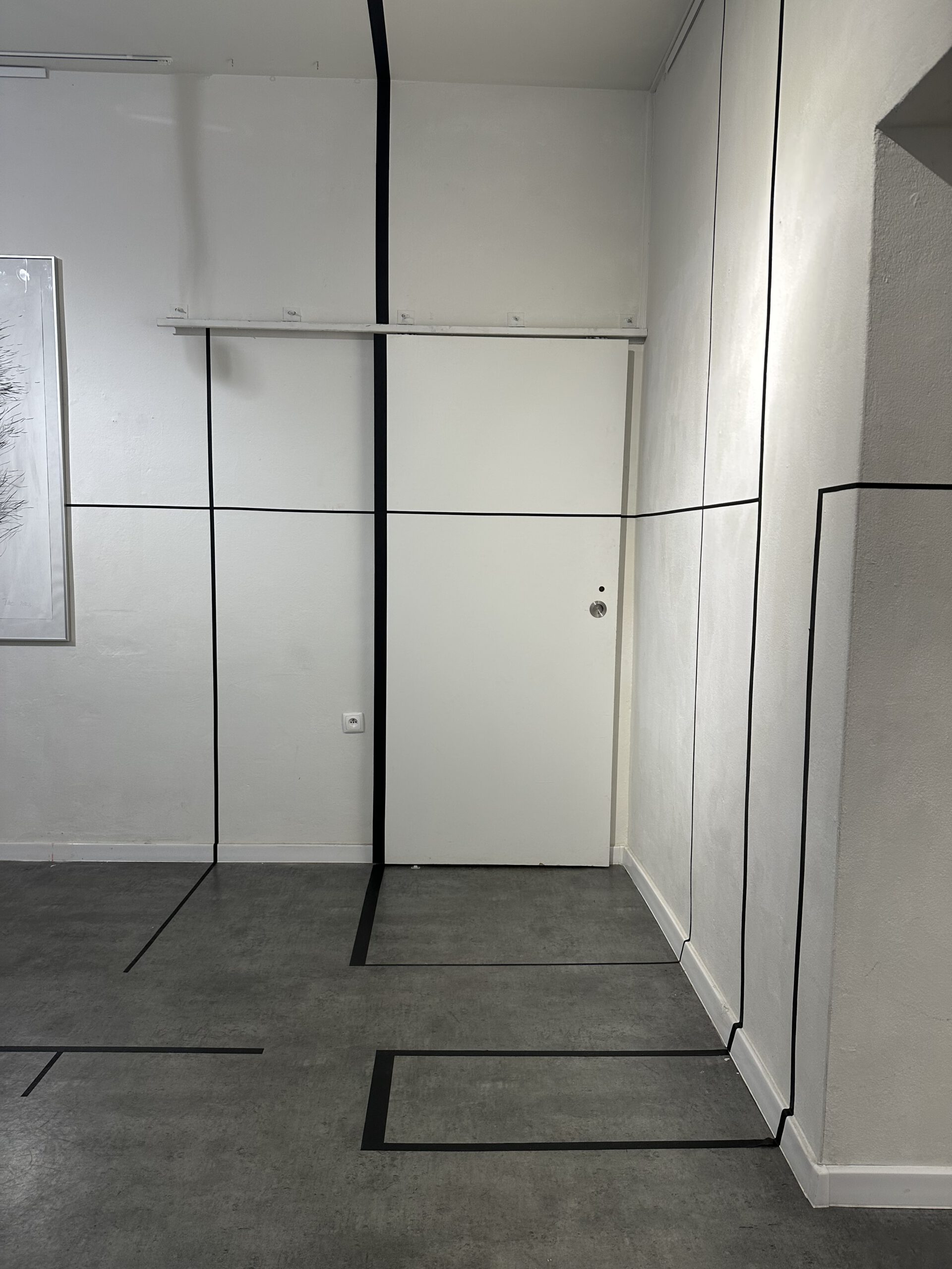Angela Lubič’s spatial drawings vary and irritate a supposedly familiar, spatial static. On the other hand, she crystallizes elements of the space, makes them visible and refers to the situational conditions on site. She usually works site-specifically and uses lines in her expansive installations that wander through the space, mark and connect the space, and change its perspective. Following the walls, window recesses and protrusions, lines run through the room and create their own surfaces, circumscribe outlines, occupy their own spaces and thus question the architectural space. The existing walls dictate the course of the lines.